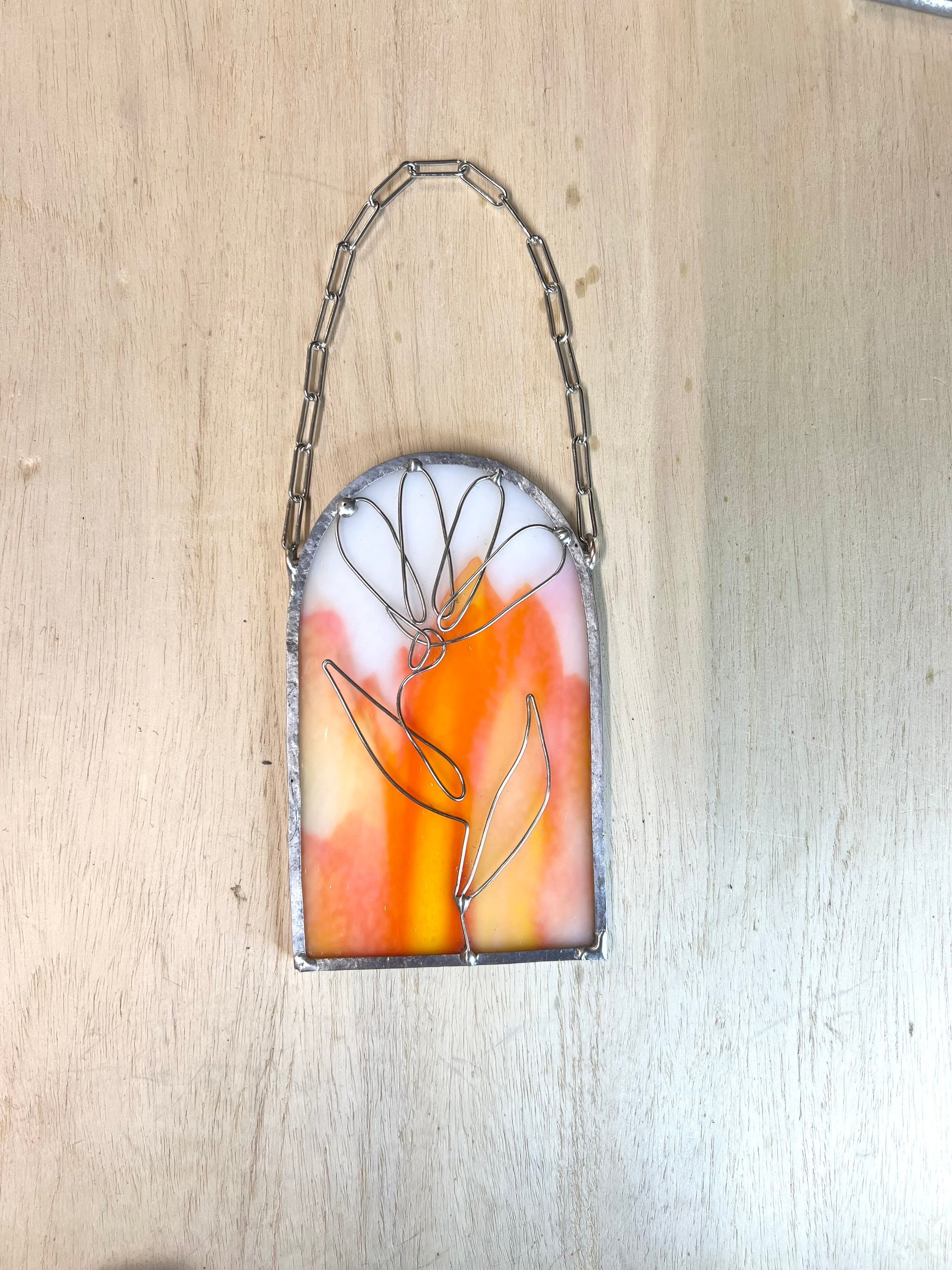 Handmade stained glass suncatcher. Monoline wire Tulip on Bullseye orange and white opalescent glass. Silver lead frame with Silver wire and 8in silver paperclip chain. Dimensions: Approx 5”h x 2”w Each is made to order!