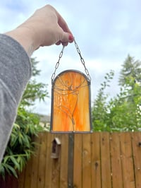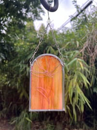 Handmade stained glass suncatcher. Monoline wire Ruffled Poppy on Wissmach orange glass. Silver lead frame with silver wire and 8in silver paperclip chain.Dimensions: Approx 5”h x 2”wEach is made to order!